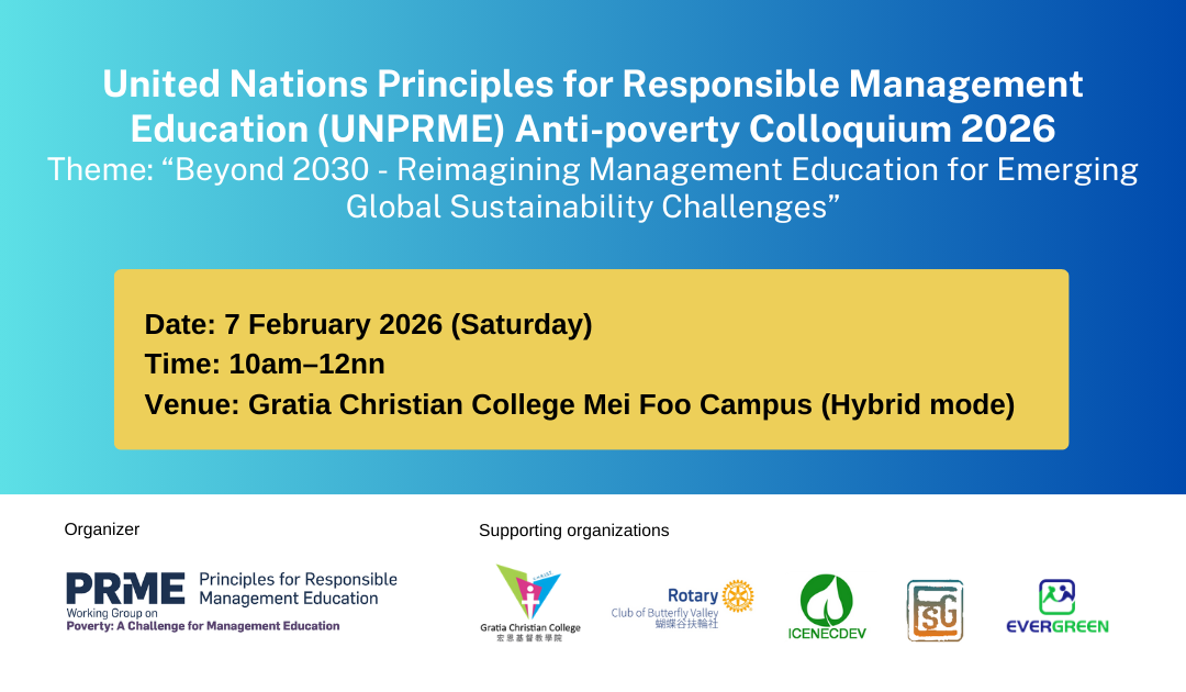 United Nations Principles for Responsible Management Education (UNPRME) Antipoverty Working Group will convene the first Anti-poverty Colloquium, themed “Beyond 2030 - Reimagining Management Education for Emerging Global Sustainability Challenges”.