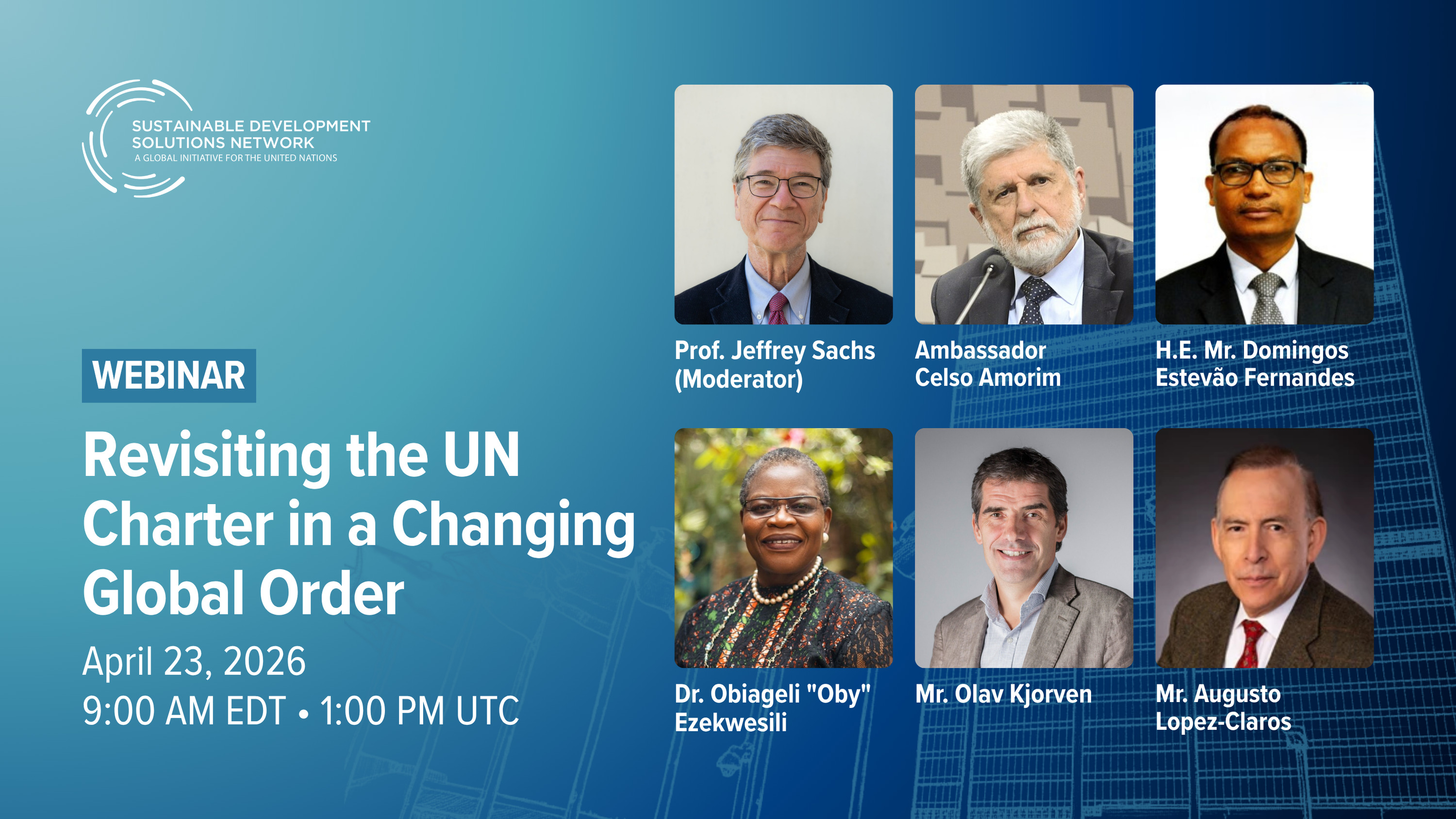 The first session, ‘The Geopolitics of War and Peace,’ will explore recent crises rapidly reshaping the geopolitical landscape and propose actionable solutions. The webinar will be moderated by SDSN President Professor Jeffrey Sachs and will feature global foreign policy experts.