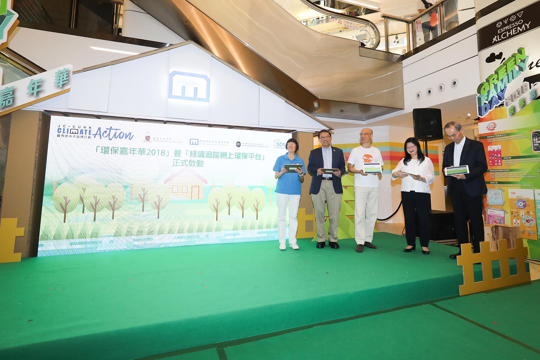 The Launch Ceremony for ‘Green Family Day 2018’ and the ‘Action Monitor’ of the JC–CUHK Climate Action was held today (19 May). Officiating at the ceremony were Mr WONG Kam-sing, Secretary for the Environment of the Government of HKSAR, Ms Imelda CHAN, Head of Charities (Grant Making – Elderly, Rehabilitation, Medical, Environment & Family) of The Hong Kong Jockey Club, Professor Rocky S. TUAN, Vice-Chancellor and President of CUHK, Dr Rebecca LEE, Founder of the Polar Museum Foundation, and Professor FOK Tai-fai, Pro-Vice-Chancellor and Vice-President of CUHK, and Chairman of the Steering Committee for the Jockey Club Museum of Climate Change.