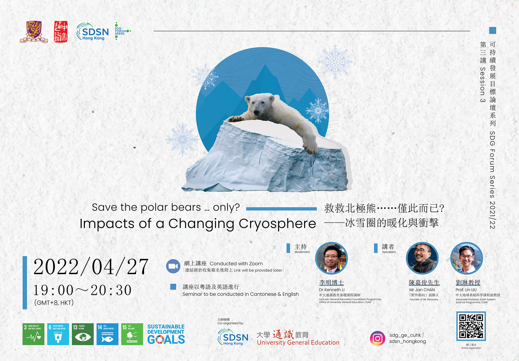Undernourished polar bears being stranded on melting ice, staring out at sea, lamenting the loss of their habitat… does the above description sound familiar to you? In the past few decades, the cryosphere, which encompasses all the frozen places on our planet like glaciers, continental ice sheets, permafrost, snow and ice, has been melting at an unprecedented rate. What do you think are the impacts of a melting cryosphere? Not only does the melting in the Polar Regions threaten the existence of ice-dependent species, it also has significant impacts on water supply, food production, infrastructure and the risk of floods and droughts. In this SDG Forum, Prof. Lin LIU will present the latest scientific findings on the changing cryosphere and how the melting in the Polar Regions hinders the progress in achieving the Sustainable Development Goals (SDGs), in particular, SDG 13 (Climate Action), SDG 6 (Clean Water and Sanitation), and SDG 3 (Good Health and Well-Being). Mr Jan CHAN will share his experience in leading the expedition to the Polar Regions and highlight the importance of providing alternative learning experiences for local students to foster their sense of responsibility to society and the environment. The forum will be conducted in English, all are welcome. Click here for more details. Online Registration: |