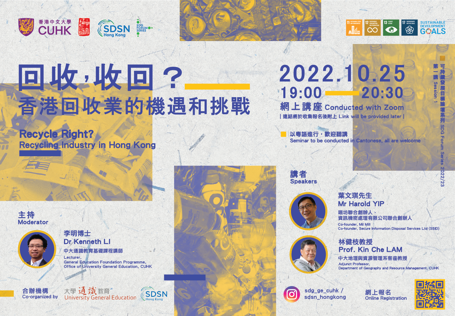 ‘Dump Less, Save More, Recycle Right’, slogans on recycling are no strangers to Hong Kong citizens. Yet, the industry itself and the culture of recycling in Hong Kong are still far from catching up. With the recent establishment of ‘GREEN@COMMUNITY’, the government has apparently taken heed of recycling and environment industry. Under the pressure of land resources and the growing waste loads, more have come to realise the importance of waste reduction and recycling, but the ‘how’ remains as a great challenge. In this SDG Forum, Mr Harold YIP and Prof. Kin Che LAM will engage in a dialogue and share their experiences from the field. Both speakers look forward to interacting with the audience and thinking about the challenges and opportunities of the recycling industry in Hong Kong. This talk is highly relevant to a number of Sustainable Development Goals (SDGs), in particular, SDG 11 (Sustainable Cities and Communities), SDG 12 (Responsible Consumption and Production), SDG 13 (Climate Action) and SDG 17 (Partnerships for the Goals). The forum will be conducted in Cantonese; all are welcome. Online Registration: |